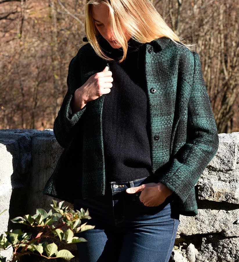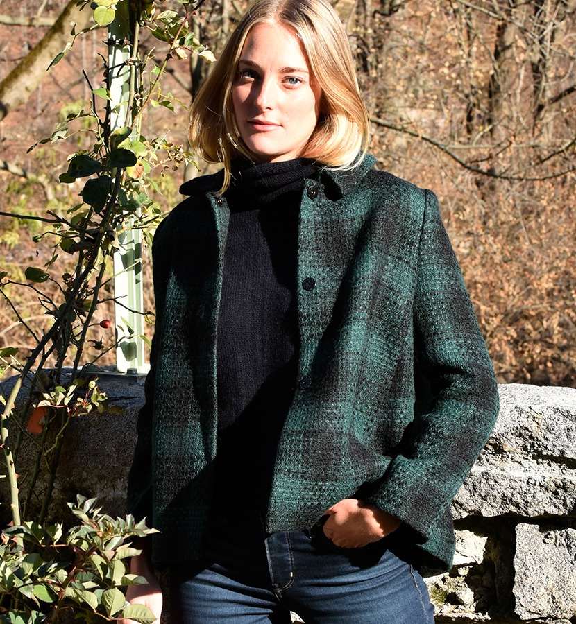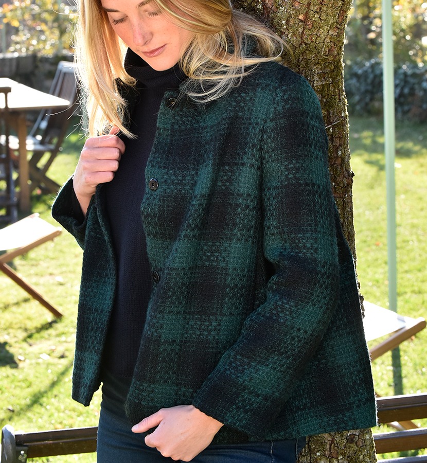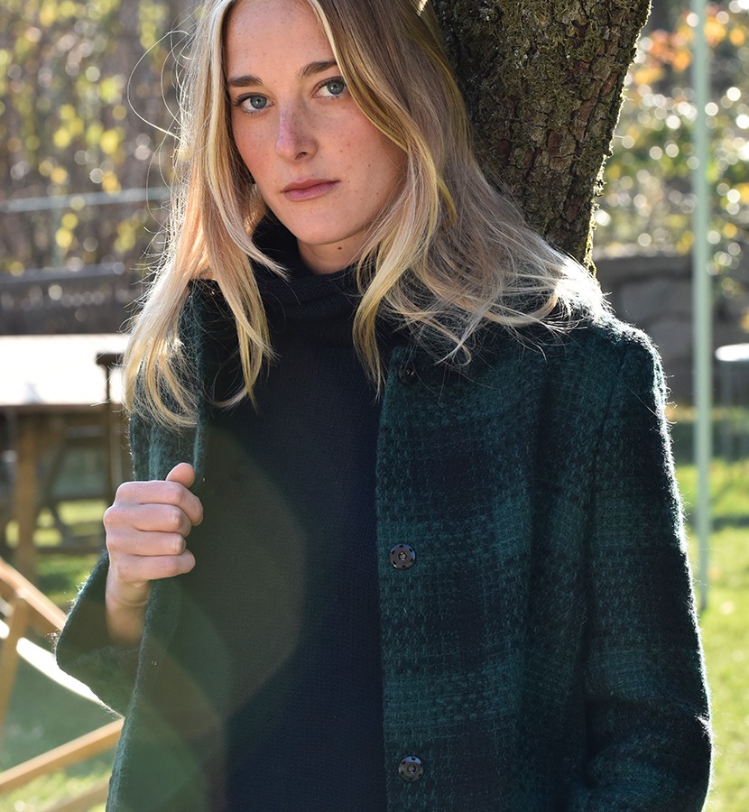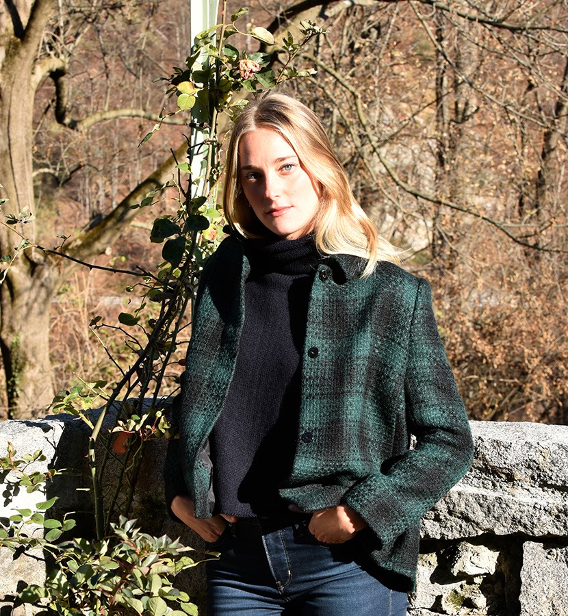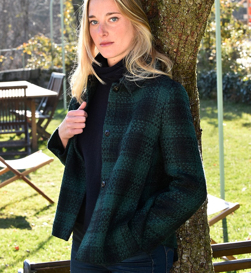 Blu e verde, la giacca in tessuto tartan realizzato in lana merino dona un tocco chic a qualsiasi outfit ed è perfetta per qualsiasi occasione. Senza tempo l’abbinamento con il dolcevita blu in 100% cashmere.