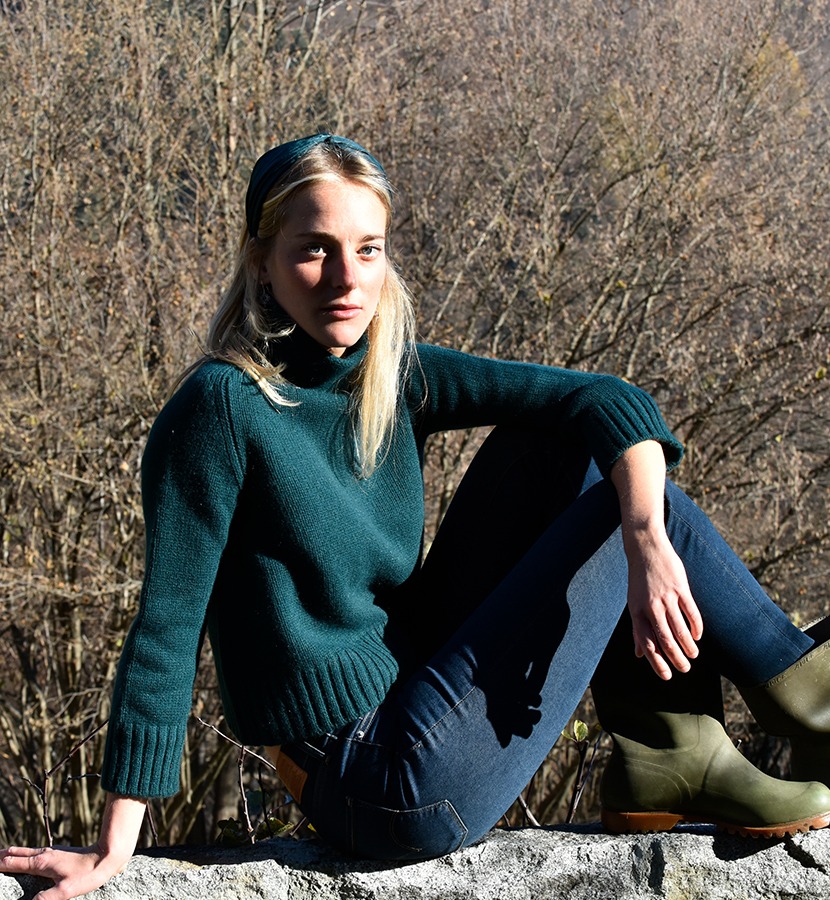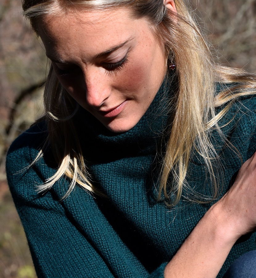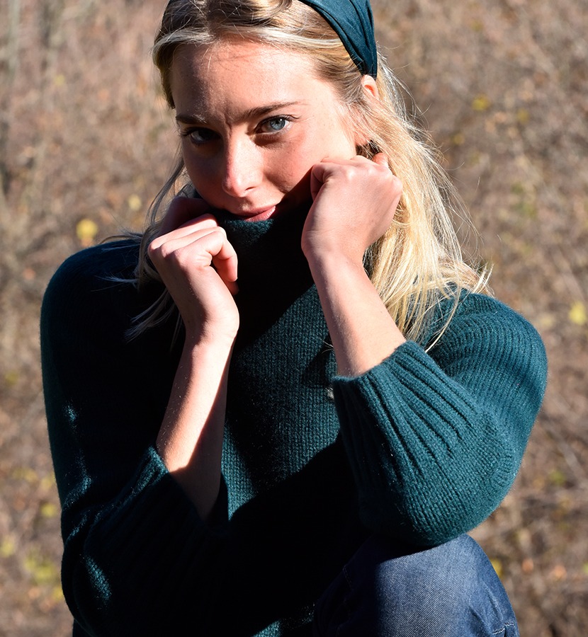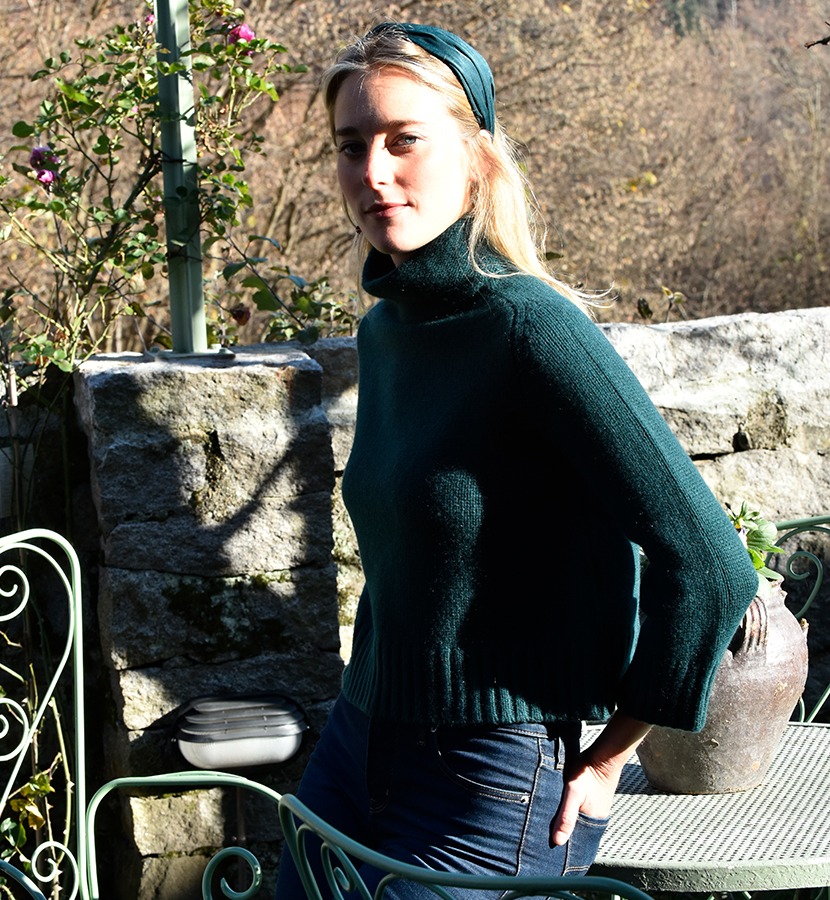 È di uno splendido color petrolio la maglia con collo a cratere in 100% cashmere. Per dare un tocco di brio a una grigia giornata invernale.